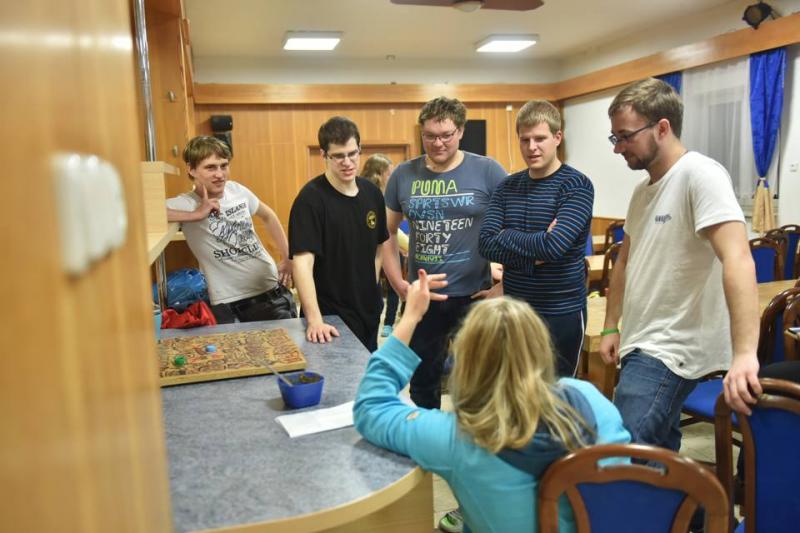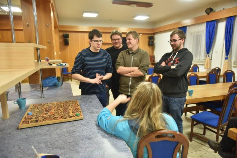 V pátek podvečer se všichni účastníci postupně slezli na Relaxe, kde nás po večeři čekala praktická ukázka indoor her. Na začátek jsme si procvičili své pantomimické, řečové a hmatové dovednosti u oblíbené hry Stavitelé, ve které se slepý dělník snaží postavit dle pokynů stavbyvedoucího, který mu slovně vysvětluje, co má dělat. Stavbyvedoucí přijímá pokyny od architekta, který však nemůže mluvit - tedy pomocí pantomimy vysvětluje, co se má stavět, jako jediný totiž zná zadání.