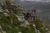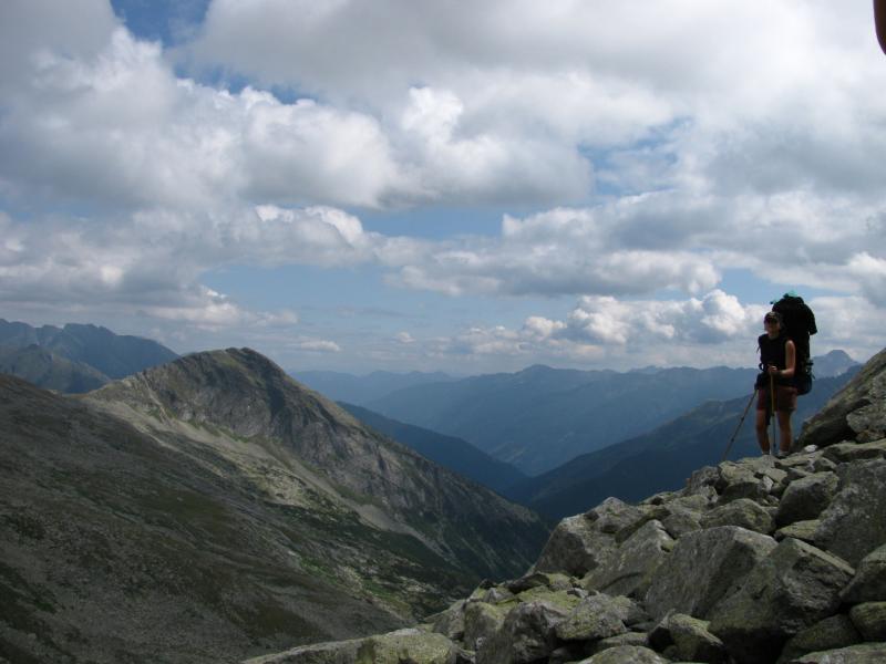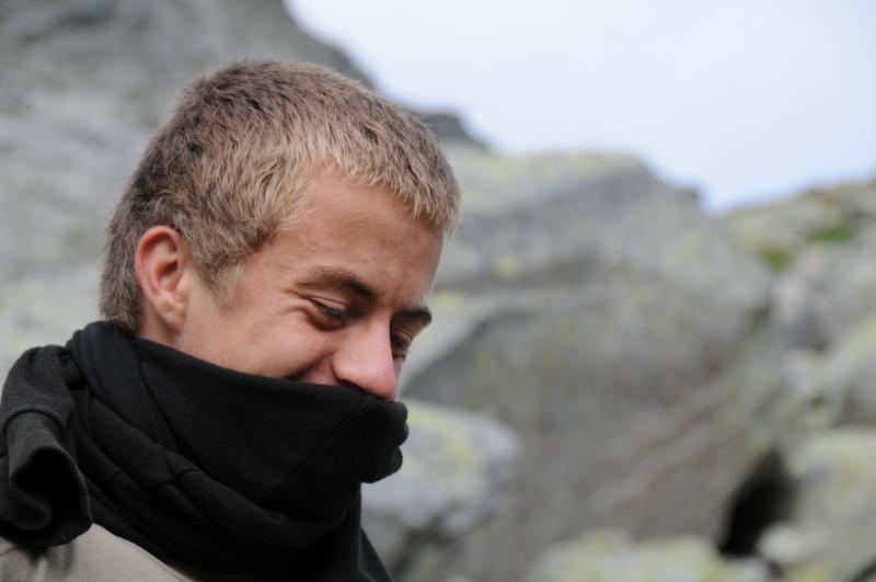 Úterý, poledne: Převýšení, které jsme za dopoledne udělali, se pohybuje kolem čísla 900, to znamená, že jsme polední přestávku brali jako vykoupení z pekel. Když jsme uviděli chatu, naše srdce radostí poskočila, ve výskoku však byla zmražena ledovým větrem, který nás na hřebínku dostal. Při každém pokusu něco ostatním sdělit jsme byli zahaleni do bílého oblaku, který nám místo slov vycházel z úst. Se slzou v oku jsme vzpomínali dobu asi před rokem, kdy jsme ve Stubaiských Alpách umírali vedrem a spotřebovávali jeden opalovací krém za druhým. Shodli jsme se, že čekat, až se uvaří jídlo, by se rovnalo smrti hladem a zimou, proto jsme jeden vařič ukryli pod lavičky a jali se vařit čaj, který by nás alespoň trochu zahřál. Z tohoto poledního procesu si donášíme poučení, že zmrzlý prst, strčený do kouřící vody, vám její horkost potvrdí až pokročilou změnou barvy, nikoliv přenosem normálních signálů do mozku, které vás donutí spálený prst rychle vytáhnout.... Dali jsme si chleba se salámem a s kečupem a pokračovali v cestě do neznáma. Chvíli jsme pochodovali po travnatém chodníčku, ale to asi jen proto, abychom měli při přelézání, prolézání, přeskakování a plazení se přes balvany na co pěkného vzpomínat. Výhled na okolní kopce byl krásný, pohled na obličeje ostatních byl o poznání horší. Při přechodu těch největších a nejhladších kamenů začalo poprchávat, takže se z nich rázem staly i kameny nejkluzčí. Jako bychom toho klouzání neměli dostatek, přišel i úsek, kde někdy v průběhu zimy spadla pořádná sněhová lavina a zanechala nám tu pozdrav v podobě menšího sněhového pole, které bylo tak prudké, že být na konci bazén, nikdo by tomuto tobogánu zajisté neodolal. Jenže pohled na místo, kde bychom bazén chtěli a fakt, že na konci je obrovská hromada kamení a jediný bazén, který by byl zde možný, by byl bazén z naší vlastní krve, nás přesvědčuje, že vezmeme nějaký ten šutřík a hle, máme krásný cepín, v době kamenné by z nás měli ohromnou radost. Nicméně, někteří i přes veškerou svou snahu sjíždějí sníh, dole je však chytají šťastlivci, kteří mají těch několik vteřin sjezdu už za sebou, a tak kontakt s tvrdou hranou balvanu tlumí tělo kamaráda:-)