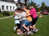 Na Relaxe nás přivítalo krásné slunečné ráno, posnídali jsme, šupli do batůžků svačiny, balíme materiál, nasedáme do aut a v koloně odjíždímě směr Rabštejnské skály:-) Parkujeme auta, cestu nahoru už musíme zvládnout po svých. Vyrazili jsme sice v davu, hezky za sebou, ale přeci jen převýšení několik stovek metrů bylo znát a někteří z nás se propadli jaksi nakonec naší početné výpravy ( včetně mně :-)),byť jsem to okecávala tím, že to "čekuju" zezadu :-)) Konečně jsme na místě. Zkoušíme vysílačky: "ručník volá mýdlo", " mýdlo slyší" a rozdělujeme se na dvě skupiny. První vyráží společně s Lídou na Rabštejnskou vyhlídku, druhá s Kubou lézt na skály. Cestou na vyhlídku obdivujeme okolí a hlavně přítomné horolezce. S údivem přihlížímeme a nevědomky nahlas komentujeme:-):-) ( Fakt jsme vám nechtěli radit :-):-) Druhá skupina si mezitím zkouší lézt po skalách, střídají se při jištění, fotíme, točíme a vůbec si ten krásný den užíváme. Balíme materiál a scházíme k hospůdce. Zde se žije na vysoké noze...a to doslova :-) Vychutnávat si pivo na lavičce, která je asi tři metry nad zemí...malé občerstvení přišlo vhod a teď nás čeká příjemná cesta...z kopce dolů. Nasedáme do aut, vracíme se na Relaxu a těšíme se na pozdní oběd. Chvíli si dáchneme a už jsme zase v pohybu. Doháníme co jsme v pátek nestihli, střídáme se na vysokých lanech a lezecké stěně. Zájemci pak vyráží se Šouvitem na paintball: Výklad o paintballu, kde a kdy se vzal, formy her, zbraně, střelivo, bezpečnostní pravidla, nafasování zbraní a střeliva, rozdělení do týmů, tajná domluva strategie, rozmístění po herní ploše a silné zvolání: "Hra". Statečně zasaženi, jako vítězové i poražení se vracíme zpět na Relaxu.